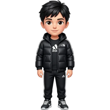 un niño que su pelo és negro i sus ojos marrones. Que vaya con una chaqueta adidas de color negro i que vaya con pantalones de chandal. I que se veaa todo el cuerpo. Que tenga una chaqueta negra con volumen i que sea north face emoji