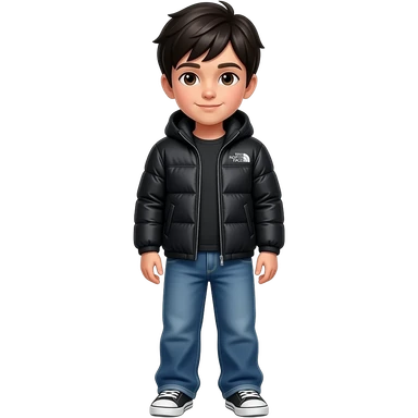 un niño que su pelo és negro i sus ojos marrones. Que vaya con una chaqueta adidas de color negro i que vaya con pantalones tejanos anchos I que se veaa todo el cuerpo. Que tenga una chaqueta negra con volumen i que sea north face emoji