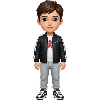 un niño que su pelo és marron i sus ojos verdes. Que vaya con una chaqueta kenzo de color negro i que vaya con pantalones de chandal i que tenga unos zapatos nike i que los pantalones sean grises emoji