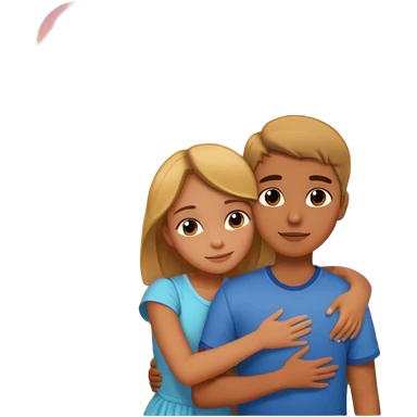 Crea un emoji donde salga un chico de pelo moreno con los ojos claros, una chica de pelo morena con los ojos marrones y UN gato europeo comun de pelaje marron oscuro y ojos verde claro, quiero que se esten abrazando el chico y la chica, y el gato este en el medio de los dos emoji