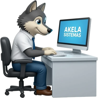 Crear un lobo trabajando en una computadora. en la computadora de la pantalla dice AKELA SISTEMAS emoji