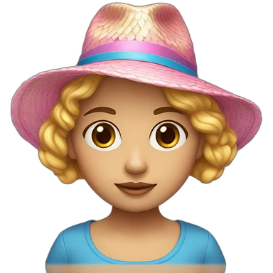 Una niña de cabello rubio corto con corte degradado y lentes oscuros, sombrero para verano rosa claro y una casaca grande hasta el cuello azul emoji | AI Emoji Generator
