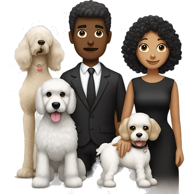 Una pareja, mujer blanca, cabello negro, hombre zambo y su perrita labrador poodle negro emoji