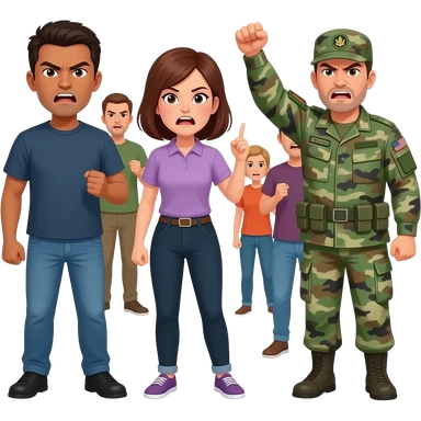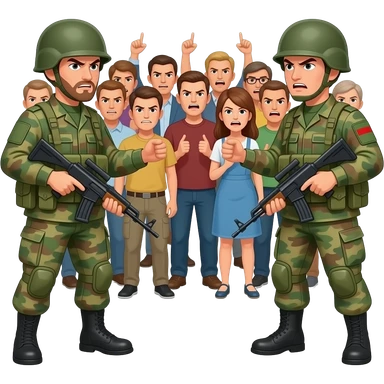 oposicion de poblacion de personas normales y militares con cara de enfadados pero los militares protestan con ellos emoji