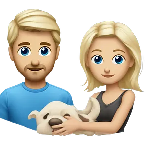 Una pareja heterosexual. La chica de piel blanca pero bronceada (española), pelo al estilo wolfcut castaño oscuro, ojos marrones. El chico de piel blanca, ojos azules y pelo castaño claro, tirando para rubio oscuro. emoji