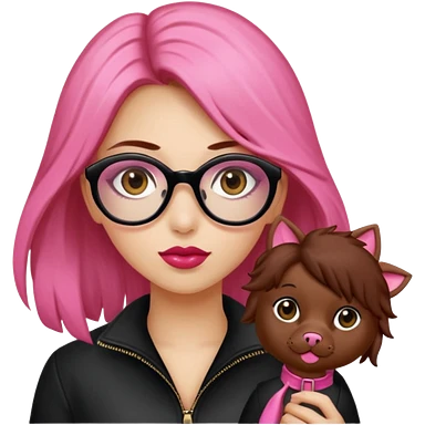 Una ragazza con i capelli neri cori con frangetta e occhiali rotondi e in braccio un maltese bianco emoji