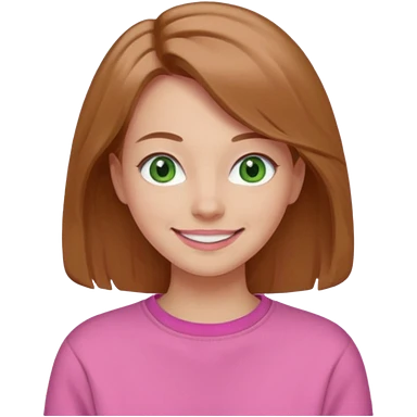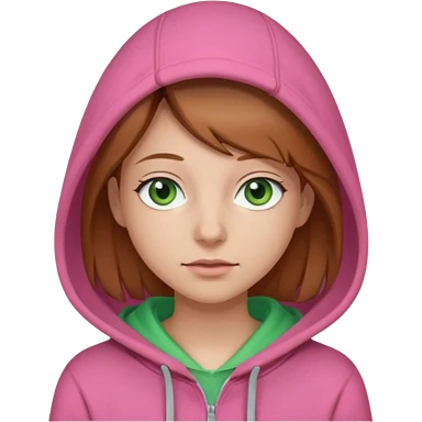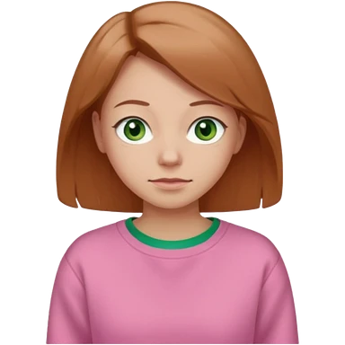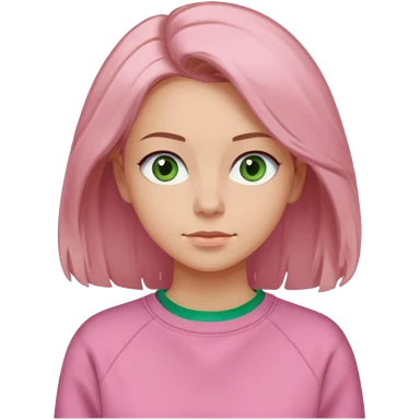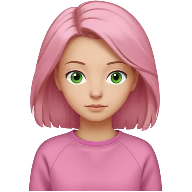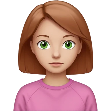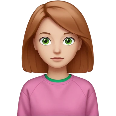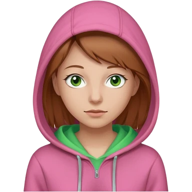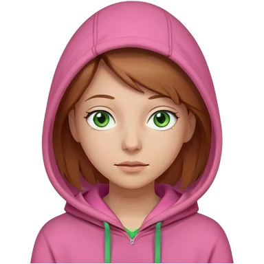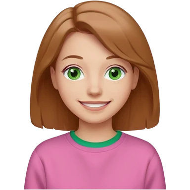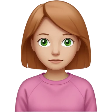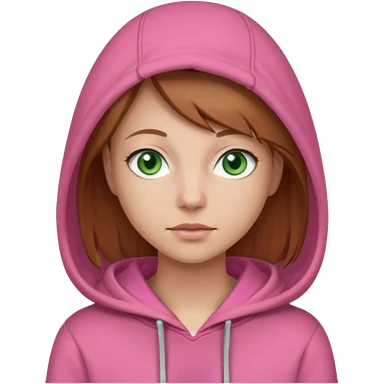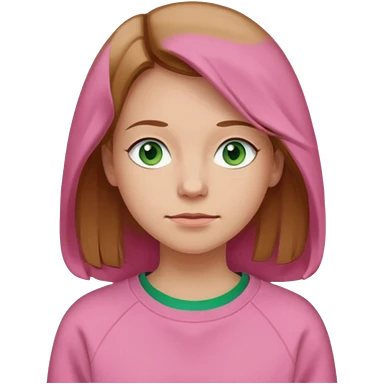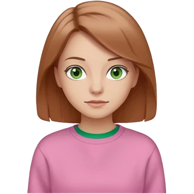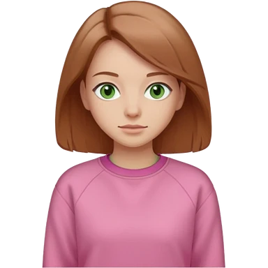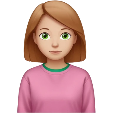 Una donna con una felpa semplice rosa, senza cappuccio. i capelli sono lunghi fino alle spalle marroni chiaro,gli occhi sono verdi e la bocca è contenta ma non sorride emoji