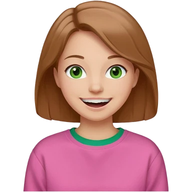 Una donna con una felpa semplice rosa, senza cappuccio. i capelli sono lunghi fino alle spalle marroni chiaro,gli occhi sono verdi e la bocca è contenta emoji