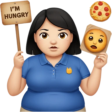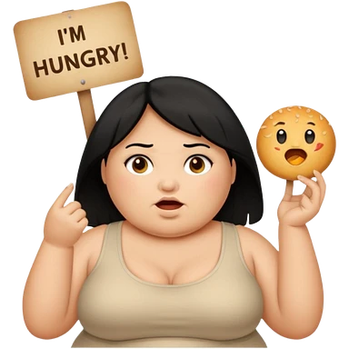 Una señora gorda con cabello negro y p olo corto con un letrero de tengo hambre emoji | AI Emoji Generator