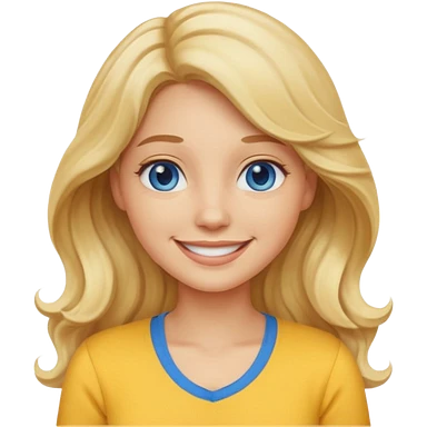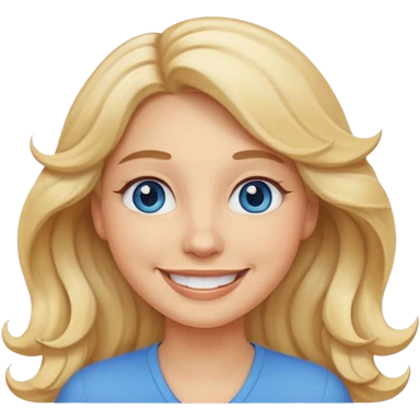 Create a custom emoji-style character inspired by a smiling woman with long, wavy blonde hair, light skin tone, and blue eyes. Emphasize a friendly, approachable expression with a bright smile and soft features. emoji