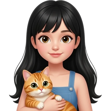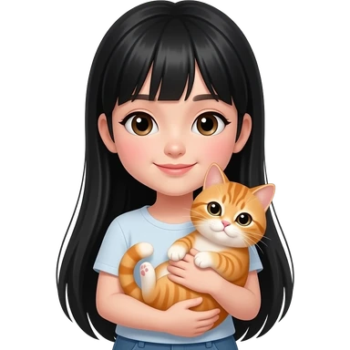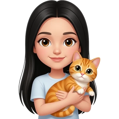 Une fille adolescente avec une peau clair avec des cheveux lisses très longs noir sans frange style clean girl qui tient et câline un chat orange emoji