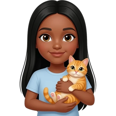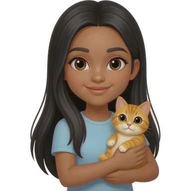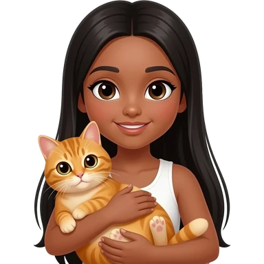 Une fille adolescente avec une peau "tan skin" avec des cheveux lisses très longs noir style clean girl qui tient et câline un chat orange emoji