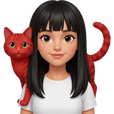 Une fille adolescente avec une peau "tan skin" avec des cheveux lisses très longs noir style clean girl avec un chat roux emoji