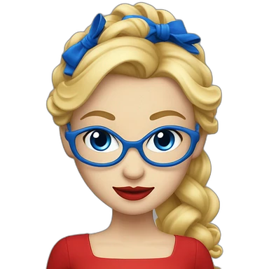 femme avec des cheveux lisse chatain clair, des yeux bleu avec des lunettes noires, un grand sourire et du rouge à lèvre rouge emoji