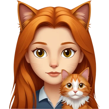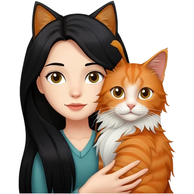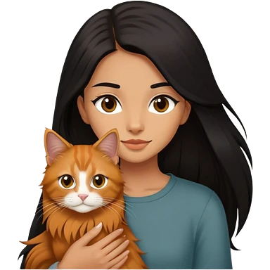 Une fille au cheveux long lisse et noir portant un chat type Maine coon de couleur roux emoji