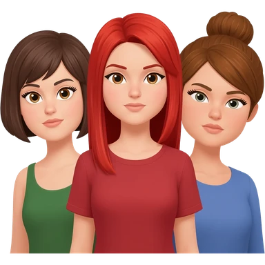 Trois femme (troupeppurquoi celle de droite est noire ? Blanche aux yeux bleus stp) une brune cheveux au carré, une rousse cheveux longs et raides, une châtain avec un chignon emoji