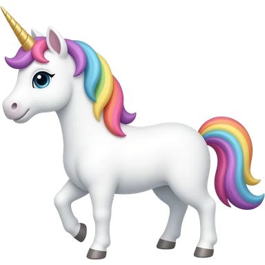 A happy, white unicorn with a colorful mane and tail, in a mid-leap pose, leaving a trail of sparkling rainbows behind. emoji