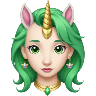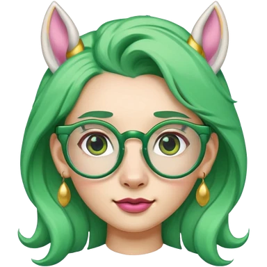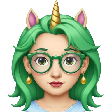 unicorn with green hair and big earrings looking into camera and spectacle emoji