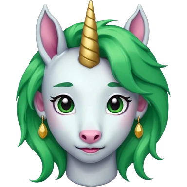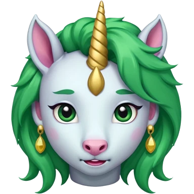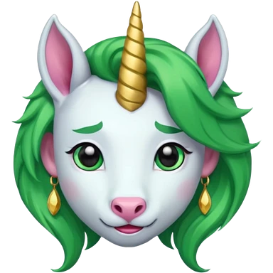 white furred unicorn with green hair and big purple earrings looking into camera and big horn and big earrings emoji