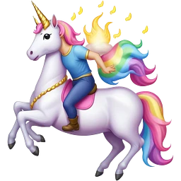 Unicorn farting sparkles while eating a cupcake over a rainbow emoji