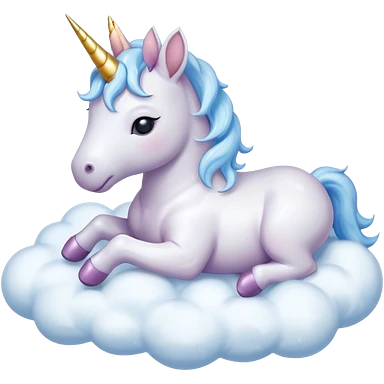 A Baby unicorn, with a sparkling horn, asleep on a white, pale blue flurry cloud, isolated emoji