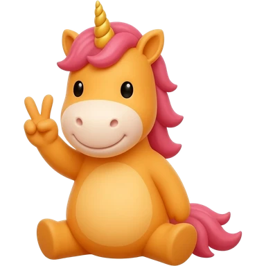 Unicornio bebé sonriente sentado y haciendo signo de paz con los dedos emoji | AI Emoji Generator
