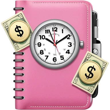 Libreta rosa, reloj femenido blanco y un dolar emoji