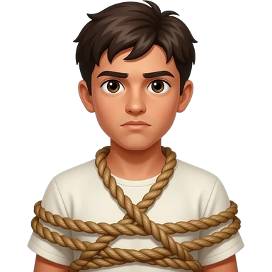 an ancient hebrew teenage boy fastened with ropes to his whole body having doubtful facial expressions emoji