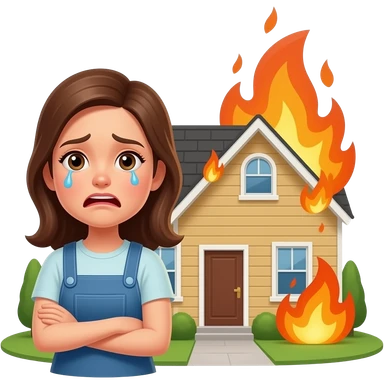 upset female homeowner standing outside home on fire emoji