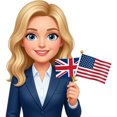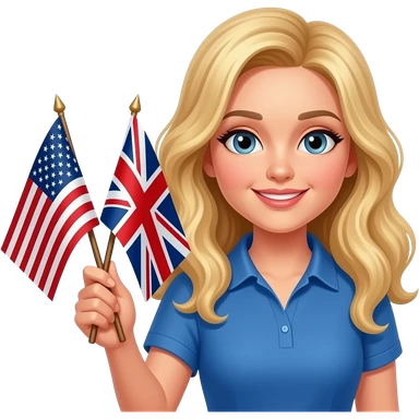 a teacher with long wavy blond hair with the usa and british flag in the right hand emoji