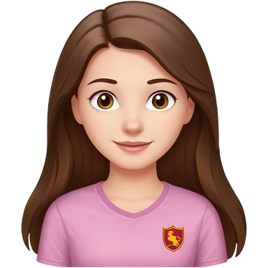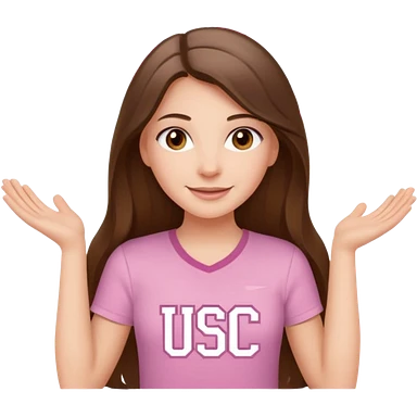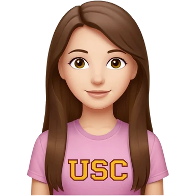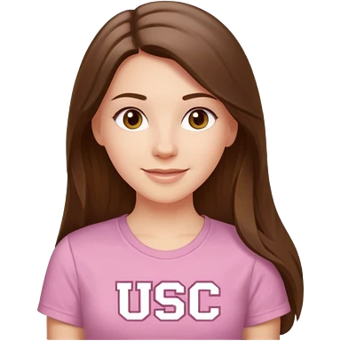 happy white long brunette hair girl with hazel eyes and in a light pink shirt with USC in white emoji