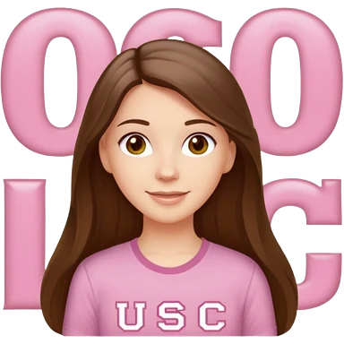 happy white long brunette hair girl with hazel eyes and in a light pink shirt with the letters USC in white emoji