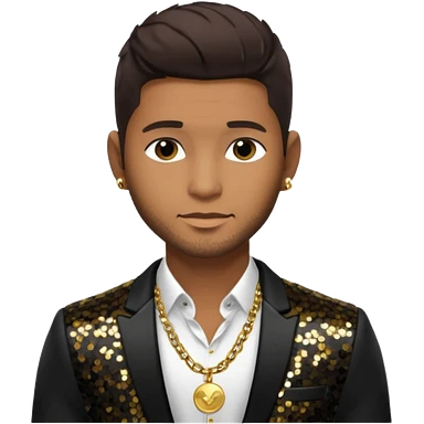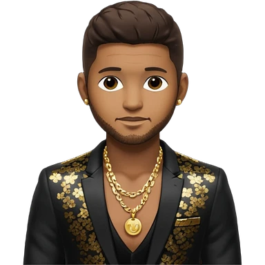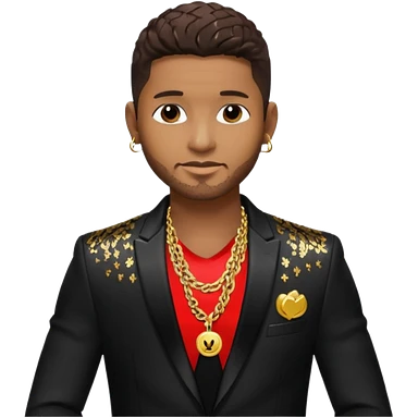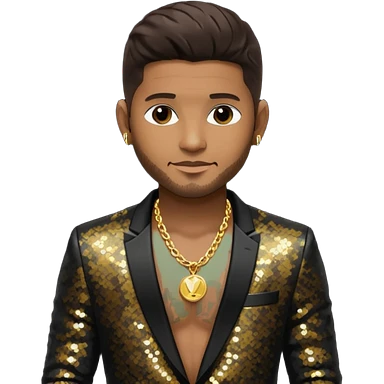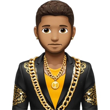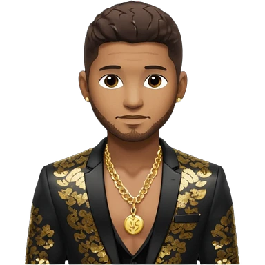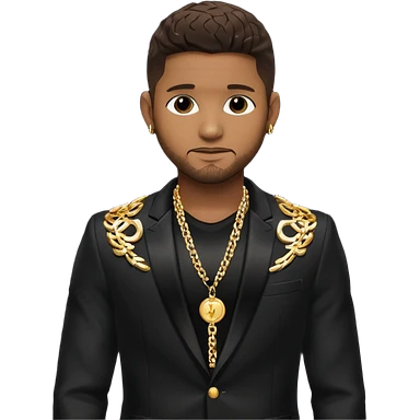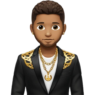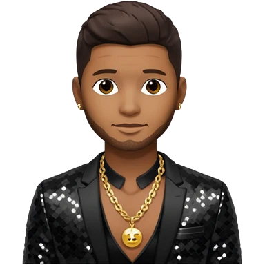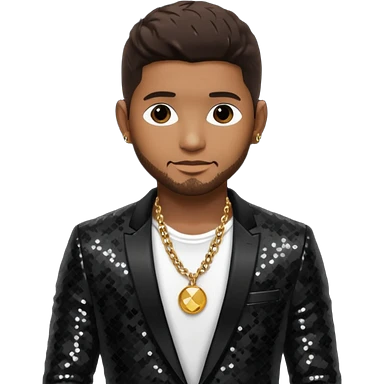 Usher with dark brown hair, black sequin suit jacket, shirtless with necklace emoji