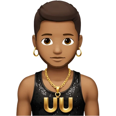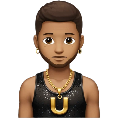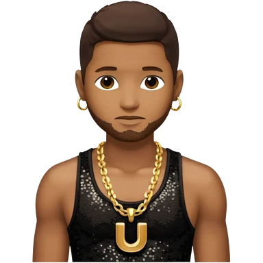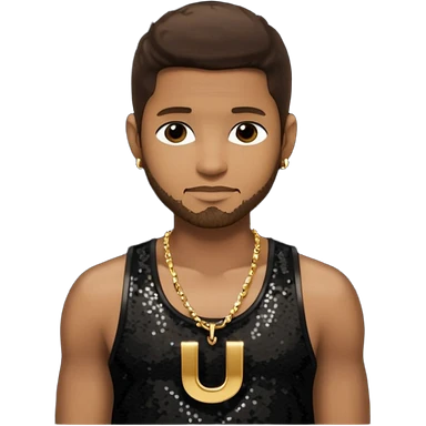 Usher with dark brown hair, black sequin tank top, necklace with letter u emoji