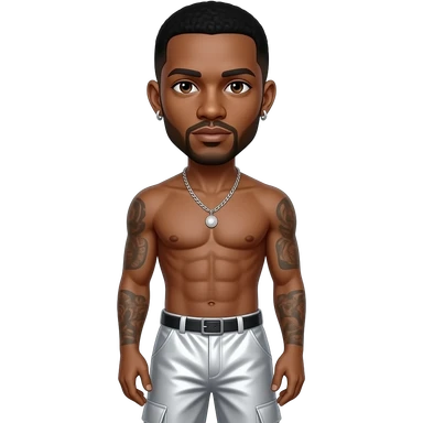 Usher with brown eyes, black buzz cut hair, white metallic baggy pants, shirtless with necklace and earrings emoji