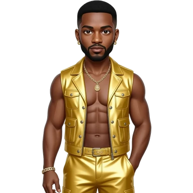 Usher with black buzz cut hair, brown eyes, butter yellow metallic vest, butter yellow metallic baggy loose pants, shirtless with necklace and earrings emoji