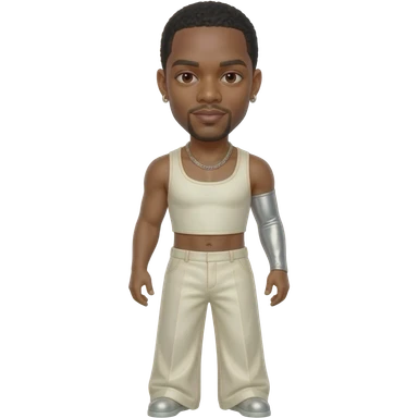 Usher Raymond with dark brown eyes, black hair, ivory metallic arm sleeve shrug crop top, ivory metallic wide leg pants, silver necklace and short earrings emoji
