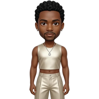 Usher Raymond with dark brown eyes, black hair, ivory metallic sleeveless crop top, ivory metallic wide leg pants, silver necklace and short earrings emoji