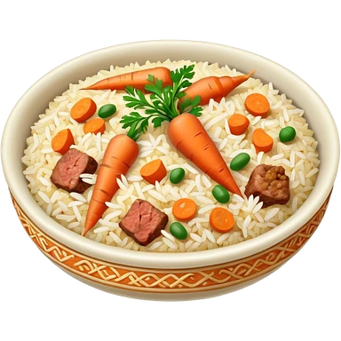 Uzbek cuisine humanless avatar in bright emoji-style illustration. Classic dishes like plov and samsa, warm golden and earthy tones, simple shapes, flat design, high contrast, friendly and appetizing. emoji
