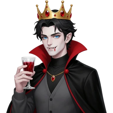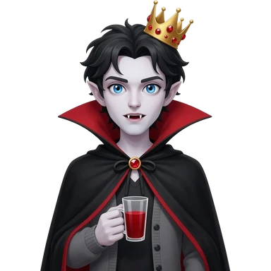 vampire prince, messy dark hair, bright blue eyes, small fangs, slightly pointed ears, golden crown with red gems, black cape with red lining, grey cardigan, gothic fantasy style, drinking blood from a cup, hyperrealistic emoji