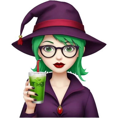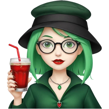 vampire green hair Drink holders with hat, wearing glasses, female,,teeth looks like vampire emoji | AI Emoji Generator