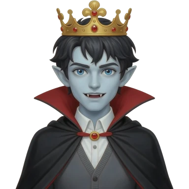 vampire prince, messy dark hair, bright blue eyes, small fangs, slightly pointed ears, golden crown with red gems, black cape with red lining, grey cardigan, gothic fantasy style, drinking blood from a cup, hyperrealistic emoji | AI Emoji Generator