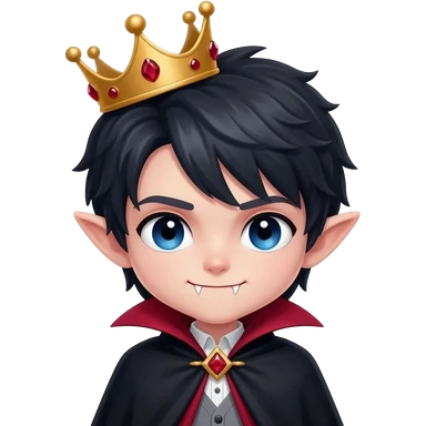 chibi vampire prince, messy dark hair, bright blue eyes, small fangs, slightly pointed ears, golden crown with red gems, black cape with red lining, grey cardigan, gothic fantasy style, cute chibi proportions, discord emoji style emoji