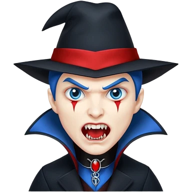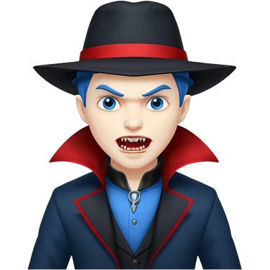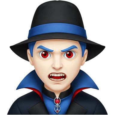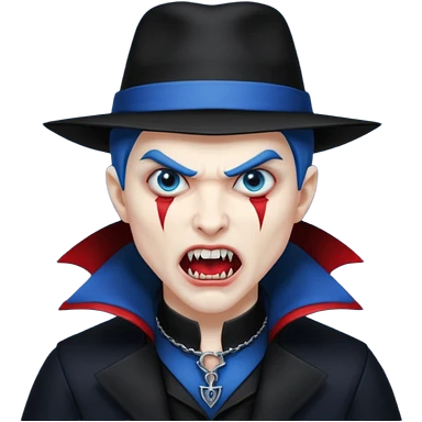 Vampire with blue hat,black coat with read collared ,teeth looks like vampire with aggression on face, full body. emoji