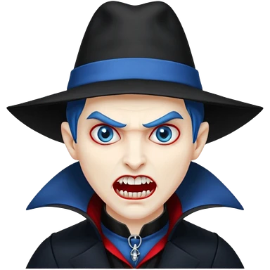 Vampire with blue hat ,black coat with read collared ,teeth looks like vampire with aggression on face and a full body. emoji