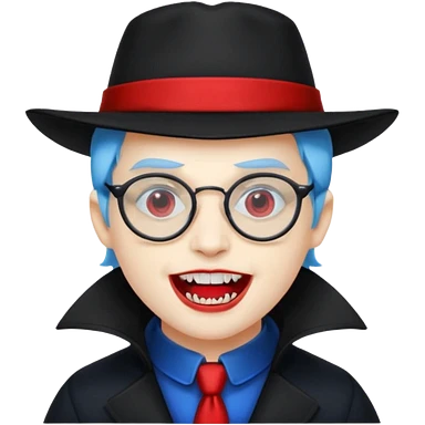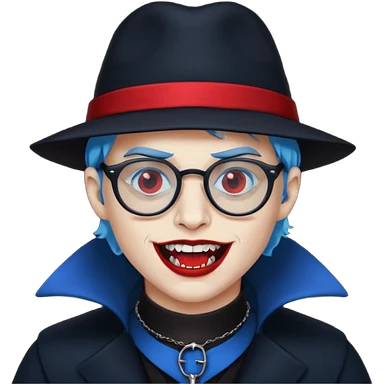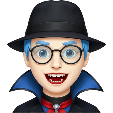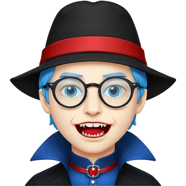 vampire with blue hat,black coat with read collared ,teeth looks like vampire, with glasses emoji