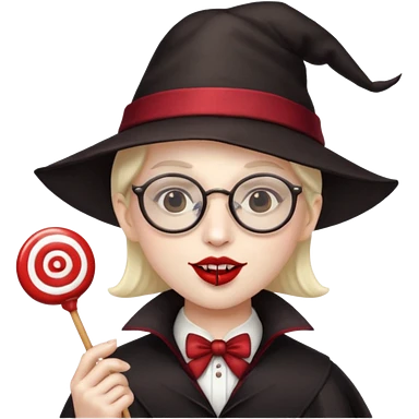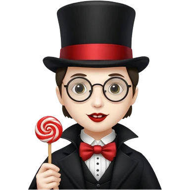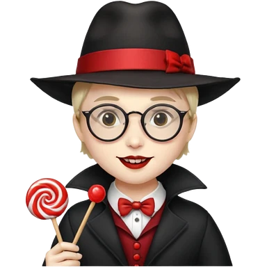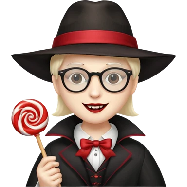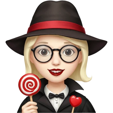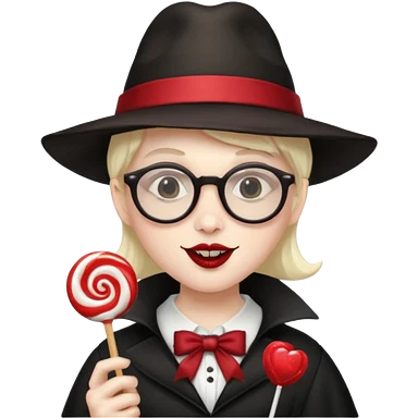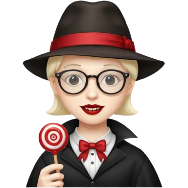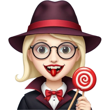 Vampire with lollipop, beret and glasses, teeth looks like vampire emoji | AI Emoji Generator