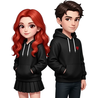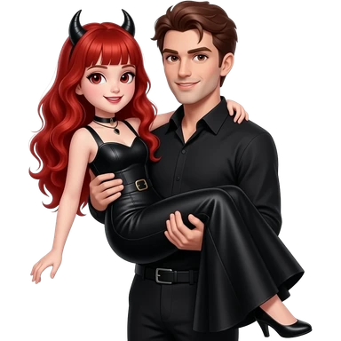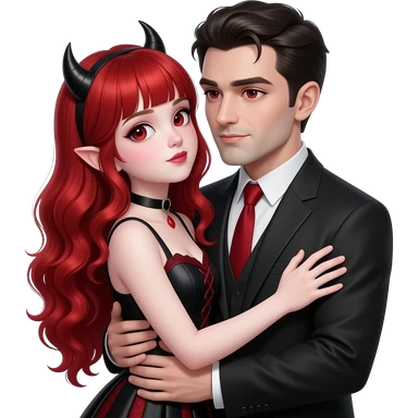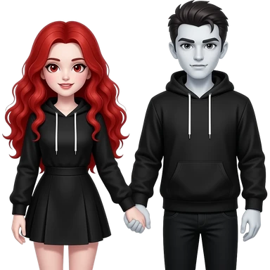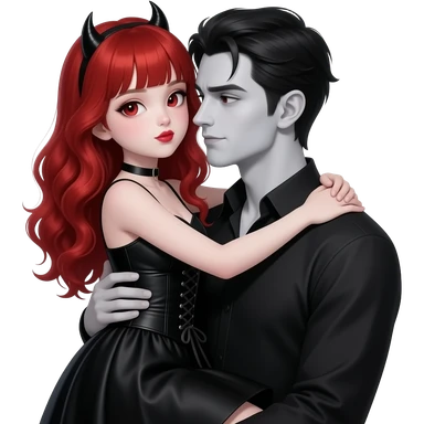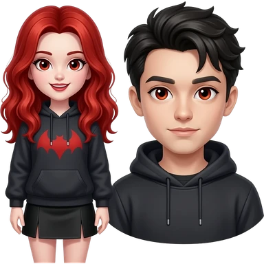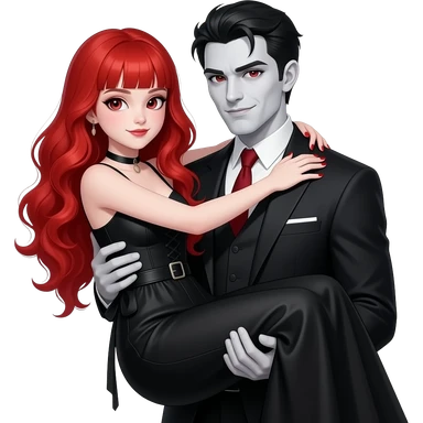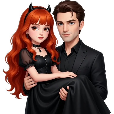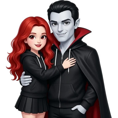 Vampiro femmina 12enne con pelle BIANCA capelli lunghi rosso fuoco ondulati e che indossa una vestito stretto in vita e largo e lungo sotto nero con maniche lunghe e anfibi che arrivano alle ginocchia che bacia un vampiro con la pelle bianca al chiaro di luna emoji | AI Emoji Generator