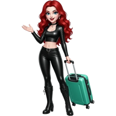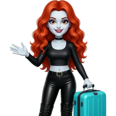 Vampiro femmina con capelli lunghi rosso fuoco ondulati con pelle bianca che indossa degli stivali neri stretti dei leggins di pelle nera e un top corto con maniche lunghe e strette nero che tiene una valigia a ruote verde acqua che saluta emoji