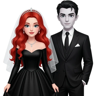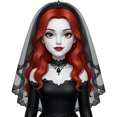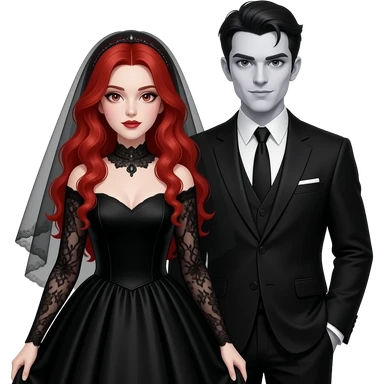 Vampiro femmina adolescente con capelli lunghi rosso fuoco ondulati con pelle bianca che indossa un vestito da sposa lungo con le maniche lunghe e nero e il velo nero con le ginmiciu nereche si sta sposando con il suo ragazzo VAMPIRO con la pelle chiara emoji